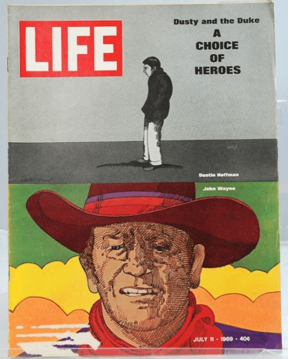 Finally, let’s look at the top right corner of the magazine cover: Dusty and the Duke, a Choice of Heroes. Hoffman had shot to stardom a year and a half before with the release of The Graduate in December of 1967; Midnight Cowboy was his follow up.